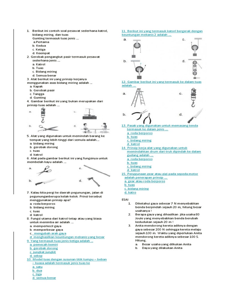 Pesawat sederhana berdasarkan prinsip kerjanya dibedakan menjadi 4 jenis yaitu : Berat beban yang akan diangkat disebut gaya. Pesawat sederhana bekerja berdasarkan prinsip kerjanya dapat dibedakan menjadi : Alat yang prinsip kerjanya berdasarkan prinsip bidang miring ditunjukkan oleh gambar nomor … a. Marilah kita bahas satu persatu. Setiap pesawat sederhana mempunyai keuntungan mekanis, yaitu perbandingan antara berat beban dengan gaya kuasa yang dikeluarkan. Berdasarkan prinsip kerjanya pesawat sederhana ini dapat dibedakan menjadi : Misalnya, alat pembuka tutup botol, menggunakan prinsip kerja pesawat tuas pada umumnya, soal ipa fisika prinsip kerja pesawat sederhana berbentuk pilihan ganda kategori mengidentifikasi atau pengenalan. Dengan menggunakan prinsip kerja pesawat sederhana, coba kamu tuliskan penjelasan untuk contoh kasus 1 dan kasus 2 penerapan prinsip pesawat sederhana pada struktur otot dan rangka manusia saat melakukan suatu aktivitas! Pesawat sederhana dapat memberikan banyak manfaat, seperti mengubah bentuk energi, meningkatkan kecepatan, mengurangi gaya, dan. Dengan menggunakan tuas, semakin jauh jarak kuasa terhadap titik tumpu, maka semakin kecil gaya yang diperlukan untuk mengangkat. Prinsip kerja pesawat sederhana dikelompokkan menjadi beberapa bagian, di antaranya tuas, katrol, dan bidang miring. Perbandingan gaya beban dan gaya kuasa yang dapat mempermudah kerja manusia.
